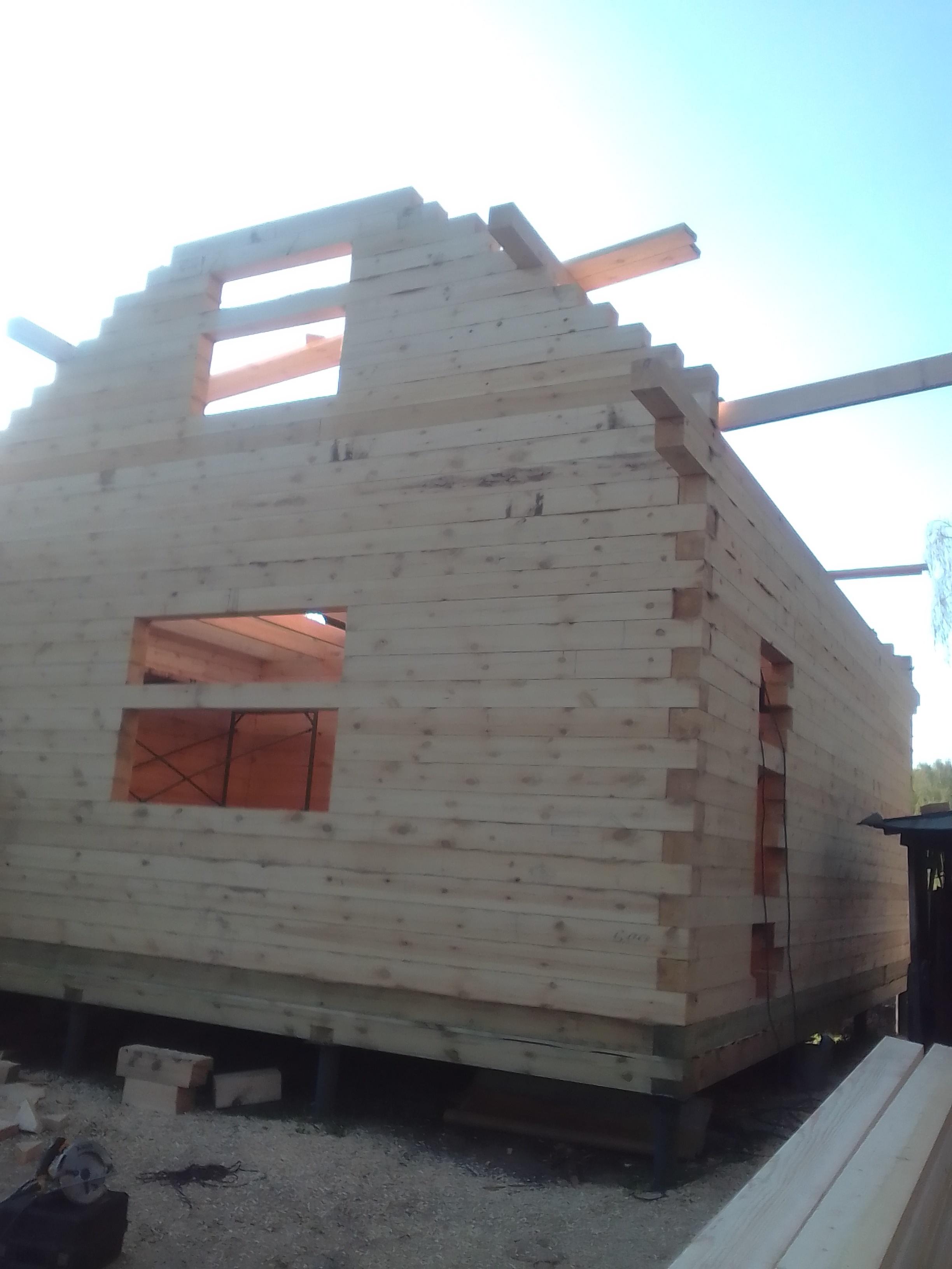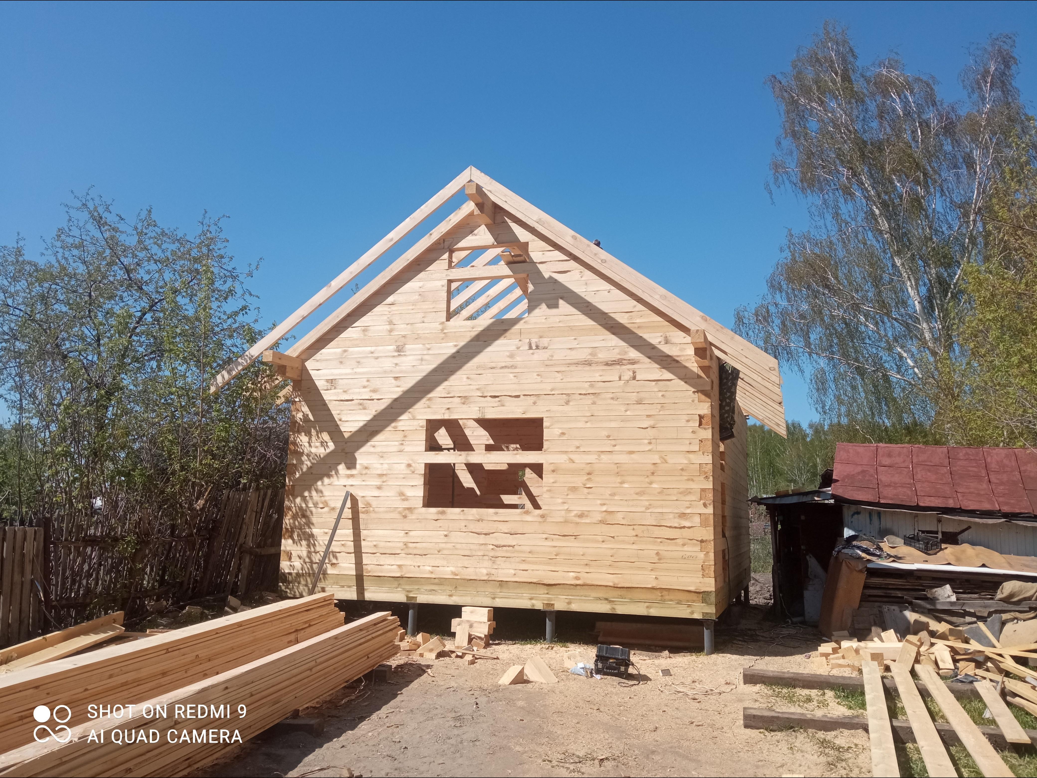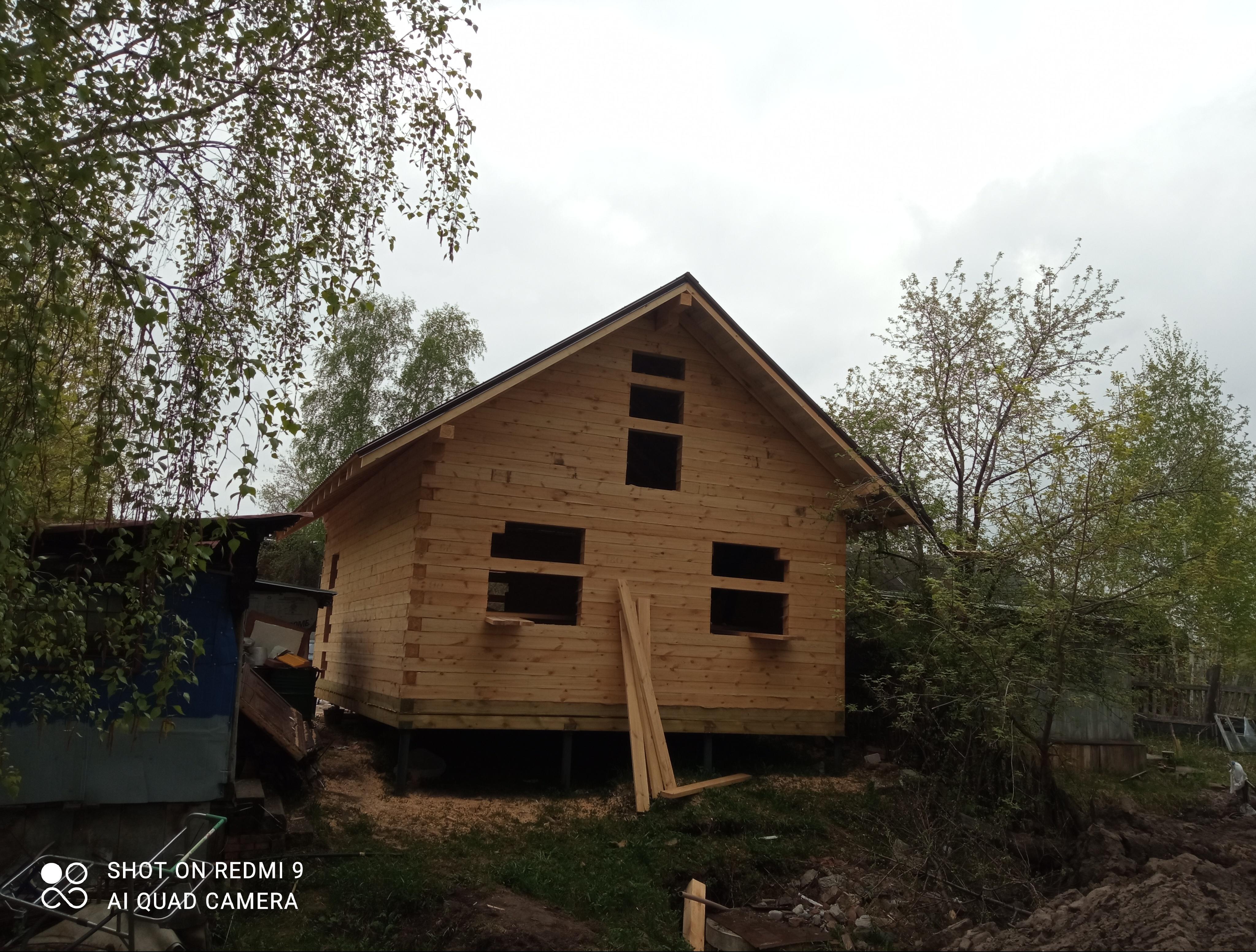 Строительство дома с мансардным этажом 8х6 из бруса 150х150 в СНТ Яблоневый сад (ул. Тайгинская). Устройство силового каркаса из бруса на винтовых сваях. Поднятие стен и фронтонов из бруса, установка конька из бруса, устройство стропильной системы и обрешетки, настил профлиста. Дом возведен за 5 дней.