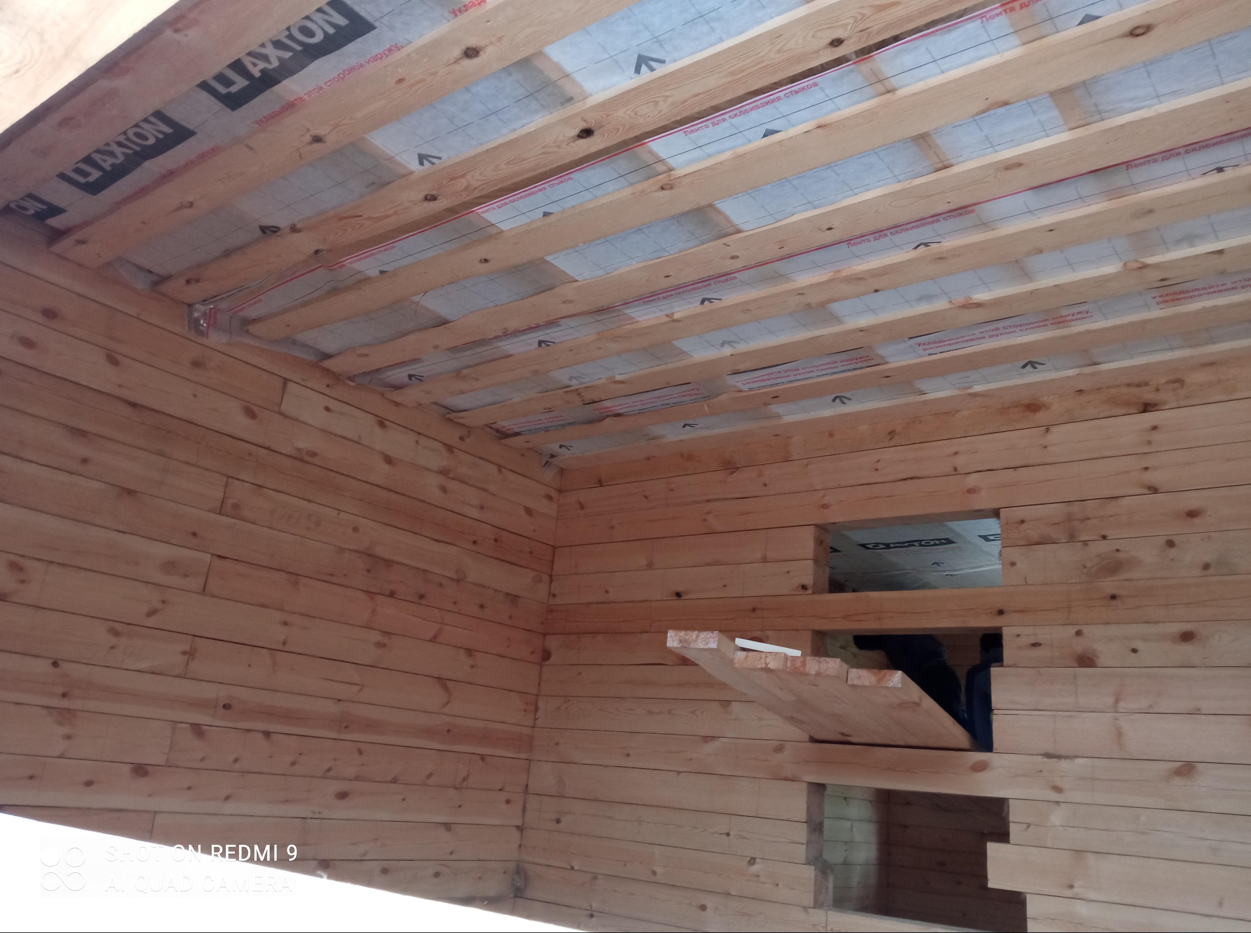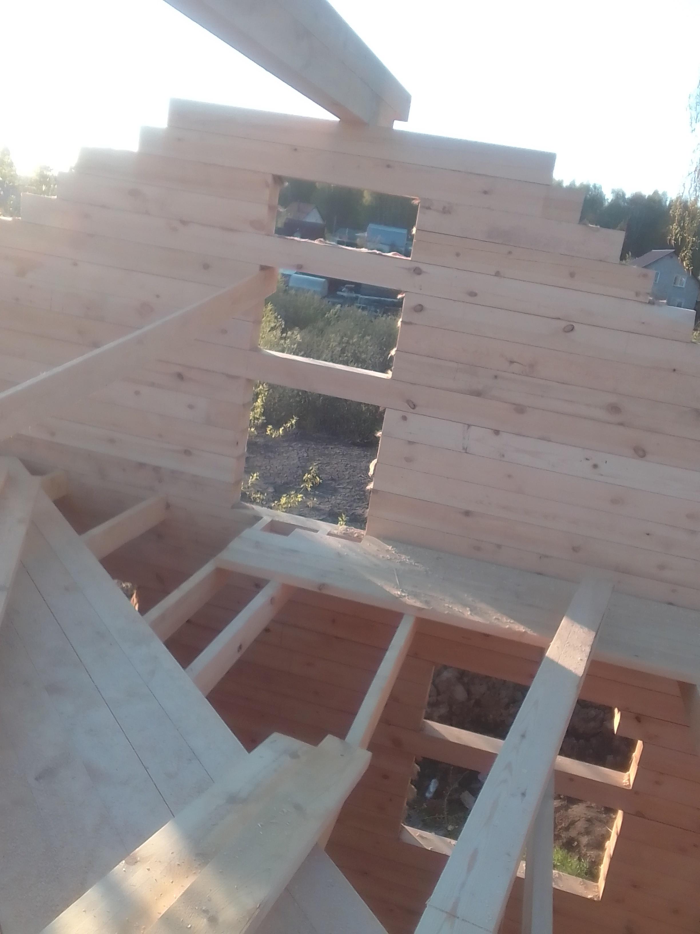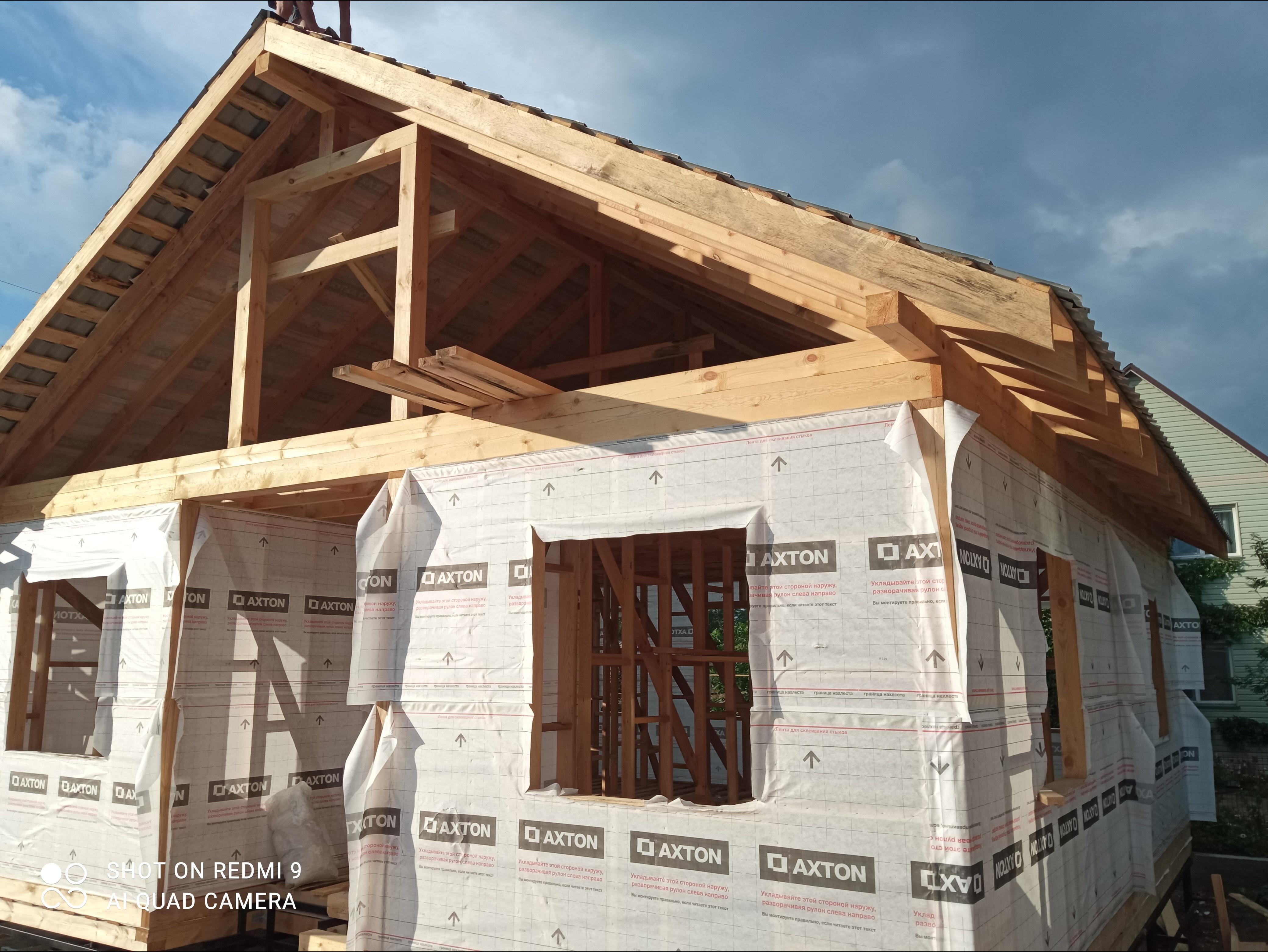 Строительство дома с мансардным этажом 8х6 из бруса 150х150 в СНТ Яблоневый сад (ул. Тайгинская). Устройство силового каркаса из бруса на винтовых сваях. Поднятие стен и фронтонов из бруса, установка конька из бруса, устройство стропильной системы и обрешетки, настил профлиста. Дом возведен за 5 дней.