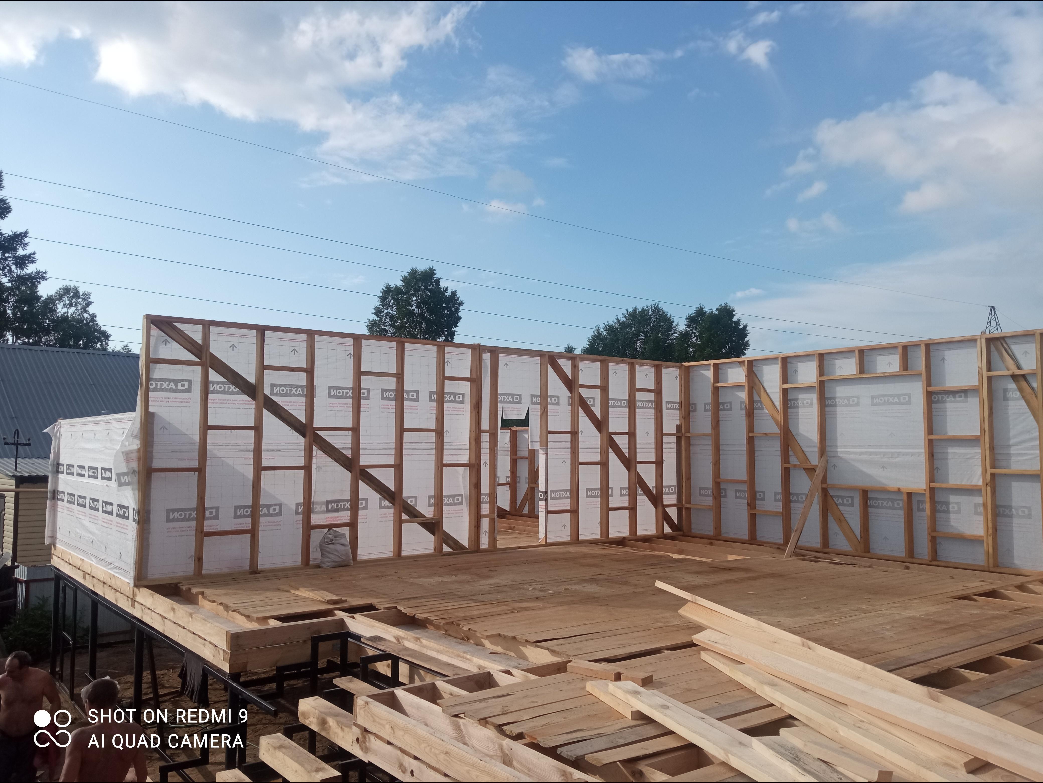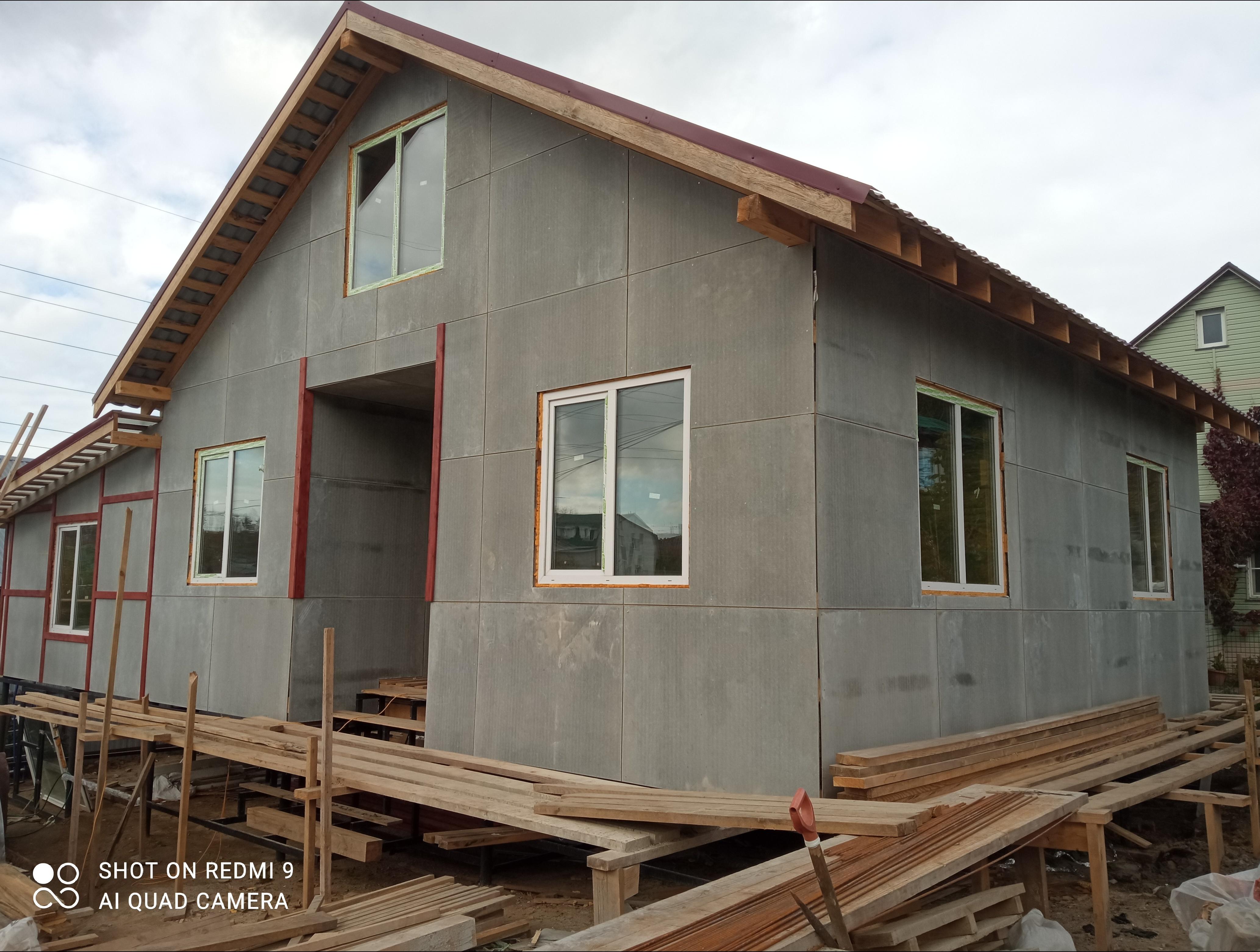 Строительство каркасного дома размерами 14х9 на Зеленхозовской из пиломатериала (сосна) естественной влажности. Весь пиломатериал приобретался на пилораме в Сосновке. Был произведен весь цикл работ: снос старых зданий на участке, вывоз строительного мусора, отсыпка участка, закручивание свай, устройство силового каркаса дома, кровля, наружняя обшивка плоским шифером. Срок произведения работ 2 месяца.